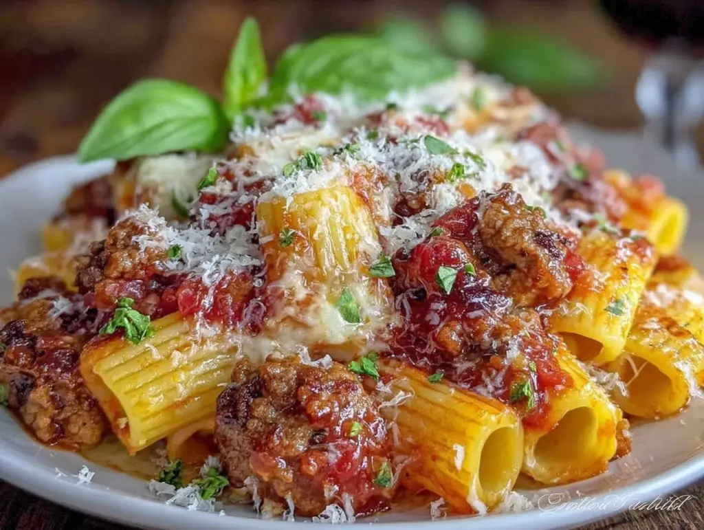 A quick and easy baked rigatoni dish loaded with Italian sausage and three kinds of cheese, perfect for a comforting dinner that’s both hearty and crowd-pleasing.